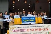 (포탈뉴스통신) 남원시가족센터는 지난 10월 2일 고유 명절인 추석을 맞이하여 관내 외국인근로자를 대상으로 음식나눔 행사를 실시했다. 이번 외국인근로자 추석음식 나눔은 JB금융그룹 전북은행 지역사랑성금 400만원을 지원받아 진행됐다. 남원시가족센터에서는 2016년부터 외국인 근로자를 대상으로 한국어 교육을 실시해 왔으며, 현재는 8개반 37명이 한국어 교육 서비스를 받고 있다. 또한 남원시가족센터는 외국인지원센터를 운영하여 증가하는 외국인 주민들의 안정적인 정착을 돕고, 지역사회의 일원으로서 통합을 지원하기 위한 다양한 체류 지원 서비스를 제공하고 있다. 이번 명절 한가위 음식나눔 꾸러미는 찰밥, 산적, 떡, 과일, 생활용품으로 구성되어 있으며, 다양한 국가(캄보디아, 미얀마, 네팔, 스리랑카, 방글라데시 등)의 근로자 70명에게 전달됐다. 나찬도 센터장은 “다문화가족과 지역민, 그리고 센터가 삼위일체가 되어 서로 소통하고 이주민들의 한국 사회정착을 적극적으로 지원하고 함께하는 센터가 되도록 적극적으로 수행해 나가겠다”라고 소감을 밝혔다. 여성가족과 김미옥과장은 “이번 추석