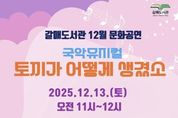 (포탈뉴스통신) 구리시 갈매도서관은 국악뮤지컬 '토끼가 어떻게 생겼소' 무료 관람 사전 신청을 11월 25일부터 갈매도서관 홈페이지에서 선착순으로 신청받는다고 밝혔다. 국악뮤지컬 '토끼가 어떻게 생겼소'라는 연말을 맞아 오는 12월 13일 오전 11시, 갈매도서관 6층 대강당에서 경기아트센터와 함께 어린이와 가족을 위해 마련된 공연이다. 이번 공연은 지역 주민들의 연말 문화 향유 기회를 확대하고자 기획됐으며, 우리 전통 판소리‘수궁가’를 모티브로 새롭게 창작된 어린이 가족 국악뮤지컬이다. 익숙한 이야기와 흥겨운 음악이 어우러져 생동감 넘치는 무대가 펼쳐질 예정이다. 특히 작품 속에는 바다 생태계를 지키는 내용과 환경의 중요성을 담은 메시지가 포함되어 있어, 관람객들이 공연을 즐기면서 자연보호의 의미를 자연스럽게 배울 수 있는 시간이 될 것으로 기대된다. 백경현 구리시장은 “이번 공연이 아이들과 가족들이 함께 웃고 공감하며 환경의 소중함을 느낄 수 있는 시간이 될 것”이라며 “환경 특화도서관으로 자리 잡은 갈매도서관에서 앞으로도 환경을 생각하고 환경의 가치를 깨닫는 다양한 프로그램이 운영되도록 노력하