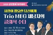 (포탈뉴스통신) 화순군은 '2025 군민행복 아카데미의 마지막 10회차 강연을 오는 12월 10일 오후 3시에 화순군청 4층 대회의실에서 개최한다고 밝혔다. 이번 강연은 클래식 연주단체 Trio MEG를 초청해 ‘사랑이 필요한 당신에게 – Trio MEG 세 남자의 클래식 수다’를 주제로 진행된다. 피아노(김용진)·바이올린(오현)·첼로(윤여훈)의 실내악 연주와 해설을 곁들인 클래식 토크 콘서트 형식으로, 누구나 공감할 수 있는 ‘사랑’을 테마로 재해석한 명곡을 군민들에게 들려줄 예정이다. Trio MEG는 2017년 창단한 클래식 전문 연주단체로 ‘Music makes Everything Grow(음악은 모든 것을 성장시킨다)’를 슬로건으로 활동하고 있다. 50여 곡의 명곡을 재창작해 발표했으며, 전국 문화재단 · 교육기관 · 지자체 · 기업 등에서 활발한 공연 활동을 이어오고 있다. 또한 KBS 클래식FM, TBS 교통방송, 한경ARTE TV 등에도 다수 출연했다. 조미화 화순군 인구청년정책과장은 “2025년 한 해 동안 군민행복 아카데미에 함께해 주신 군민 여러분께 감사