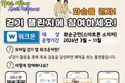 (포탈뉴스통신) 화순군은 27일 군민의 일상 속 걷기 실천을 유도하고 걷기 문화 확산을 위해 오는 3월부터 11월까지 모바일 걷기 앱 ‘워크온’을 활용한 군민 걷기 챌린지를 운영한다고 밝혔다. 이번 챌린지는 화순군민이면 누구나 참여할 수 있으며, 참여는 ▲워크온 앱 설치 ▲화순군 공식 커뮤니티 가입 ▲챌린지 화면에서 ‘참여하기’를 선택한 후 스마트폰을 소지하고 걸으면 된다. 다만, 참여 지역이 화순군으로 제한되어 있어 휴대폰 위치 설정을 반드시 활성화한 후 진행해야 한다. 화순군은 9개월간 걷기 챌린지를 운영할 계획이며, 1차 챌린지는 3월 6일부터 25일까지 20일간 진행된다. 목표는 15만 보 달성으로, 목표를 달성한 군민 90명에게는 추첨을 통해 모바일 상품권(5천 원권)을 지급할 예정이다. 박미라 보건소장은 “다양한 걷기 챌린지를 통해 군민들이 일상에서 자연스럽게 걷기 습관을 기를 수 있도록 돕겠다”라며, “걷기 실천을 통해 걷기 좋은 동네, 건강한 화순을 만드는 데 군민 여러분의 많은 참여들 부탁드린다”라고 말했다. [뉴스출처 : 전라남도 화순군]