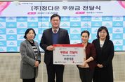 (포탈뉴스통신) 인천 미추홀구는 지난 25일 구청장실에서 사회적기업 ㈜정다운(대표 장옥순)으로부터 지역사회 나눔 실천을 위한 성금 300만 원을 전달받았다. 전달된 성금은 인천사회복지공동모금회를 통해 관내 저소득 가정 등 취약계층을 지원하는 데 사용될 예정이다. 장옥순 대표는 “지역사회에 조금이나마 보탬이 되고자 성금을 기부하게 됐다.”라며, “앞으로도 지속적인 사회공헌활동을 통해 지역과 함께 성장하겠다.”라고 전했다. 이영훈 구청장은 “어려운 이웃을 위한 따뜻한 나눔에 깊이 감사드린다.”라며, “후원해 주신 성금은 도움이 필요한 대상자에게 투명하고 신속하게 전달하겠다.”라고 말했다. 한편, 구는 앞으로도 민관 협력을 기반으로 취약계층 지원 및 복지 강화에 최선을 다할 계획이다. [뉴스출처 : 인천시미추홀구]