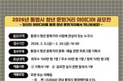 (포탈뉴스통신) 통영시는 '청년 365 핫플레이스 조성사업'과 연계한 청년 문화·예술 프로그램을 발굴하기 위해 ‘2026년 통영시 청년 문화거리 아이디어 공모전’을 개최한다고 9일 밝혔다. 이번 공모전은 통영시 청년 문화거리(죽림 만남의 광장 일원)를 중심으로 청년이 참여하고 체류할 수 있는 문화·예술 프로그램을 발굴하기 위한 것으로, 대한민국 국민 누구나 참여할 수 있다. 공모 기간은 오는 20일 금요일 오후 6시까지이며, 공모 주제는 청년 문화거리에서 실제 운영 가능한 문화·예술 프로그램 기획이다. 행사당 소요 예산은 100만 원에서 2천만 원 범위 내에서 제안할 수 있으며, 형식에는 제한이 없다. 시는 접수된 아이디어를 대상으로 창의성, 실현 가능성, 계속성 등을 종합적으로 심사해 최우수 1명, 우수 1명, 장려 3명을 선정하고, 시장 표창과 함께 각각 100만 원, 50만 원, 10만 원의 시상금을 지급할 계획이다. 선정된 아이디어는 2026년 청년 365 핫플레이스 문화·예술 프로그램 기획 및 운영에 반영돼 청년 문화거리 활성화에 활용될 예정이다. 공모전 참여를 희망하는 경우
