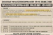 (포탈뉴스통신) “추석, 부산근현대역사관에서 가족과 함께 부산의 근현대사를 배우는 시간이 되어보세요!” 부산근현대역사관은 추석 연휴를 맞아 오는 10월 6일 오전 10시부터 오후 5시까지 시민참여 프로그램 '2025년 부산근현대역사관 퀴즈왕: 추석날편'을 운영한다고 밝혔다. 이번 프로그램은 역사관 본·별관과 전시를 관람하며 부산의 근현대사 퀴즈를 풀어보는 체험형 행사로, 역사관 관람객 누구나 참여할 수 있다. 퀴즈는 부산 근현대사의 흐름과 공간의 특성을 반영해 총 6개 영역으로 구성된다. ▲‘상설전시’ 영역에서는 개항과 근대 부산, 일제강점기와 독립운동, 피란수도 부산, 산업화와 민주화까지 부산의 역사를 한눈에 살펴본다. ▲‘본관·별관 탐방’ 영역에서는 건물과 공간이 지닌 역사적 의미를 직접 체험할 수 있다. ▲‘문화와 인물’ 영역에서는 부산 근현대사에 중요한 발자취를 남긴 인물들의 삶과 업적을 돌아본다. 누구나 무료로 참여할 수 있으며, 퀴즈의 정답을 모두 맞히면 선착순 500명에게 한국은행에서 제공하는 소정의 기념품을 제공한다. 참여방법은 본관