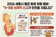 (포탈뉴스통신) 세종특별자치시 소방본부가 벌 쏘임 사고를 사전 예방하기 위해 '2026년 벌집 발생 위험 예측지도’를 제작·배포했다고 14일 밝혔다. 이 지도는 최근 3년간(2023∼2025년)의 벌집 제거 정보 기반으로 분석된 자료다. 분석 결과 관내 고위험 지역은 금남면과 조치원읍, 장군면 등으로 나타났다. 4∼5월은 여왕벌이 집터를 물색하고 산란을 시작하면서 신규 벌집이 발견되는 주요 기간이다. 이 시기에 작은 벌집이나 여왕벌을 발견해 신속히 관할 소방서에 신고하면 여름철 수천 마리로 증식하는 대형 벌집 형성을 사전 예방할 수 있다. 벌 쏘임을 예방하려면 야외 활동 시 향수나 화장품 사용을 자제하고, 어두운 색상보다는 밝은색 계열의 긴소매 옷을 착용해야 한다. 또한, 실수로 벌집을 건드렸을 경우 머리를 감싸고 신속히 20m 이상 벗어나야 한다. 벌에 쏘였을 경우엔 신용카드 등으로 벌침을 제거한 뒤 쏘인 부위에 얼음찜질을 하고 어지러움, 현기증, 두드러기, 호흡 곤란 등의 증상 시 즉시 관할 소방서(119) 신고해야 한다. 세종소방본부는 벌집 발