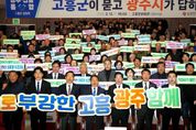 (포탈뉴스통신) 광주광역시는 12일 전남 고흥문화회관에서 ‘광주전남 행정통합 고흥군 상생토크’를 열고, 고흥군 발전 전략과 통합 이후 변화상에 대해 고흥군민들과 소통했다. 이번 행사는 여섯번째 열린 상생토크로, 통합 이후 고흥의 우주·해양·농어촌 자원을 활용해 광주·전남 균형발전을 이루기 위해 마련했다. 이날 행사에는 강기정 광주시장을 비롯해 공영민 고흥군수, 류제동 고흥군의회 의장, 고흥군민 등 600여 명이 참석해 광주전남 통합에 대한 높은 관심을 보였다. 강기정 시장은 먼저 광주전남 통합 추진상황과 향후 일정, 통합에 대한 정부 특전(인센티브) 등을 설명하며 통합 의지를 밝혔다. 강 시장은 이어 고흥군과 관련된 특별법안 특례조항으로 ▲광역생활권 지정과 교통복지 ▲항공우주 산업 육성 ▲문화관광 기반시설(인프라) 구축 지원 등을 소개했다. 특히 고흥을 비롯한 위기산업지역인 전남 동부권에 재정을 우선적으로 투입해 일자리를 지키고 광주·전남 균형발전을 이끌겠다는 구상을 발표했다. 이날 상생토크에서 공영민 고흥군수는 ▲안정적인 농어촌 재정 지원 ▲우주항공산업 육성 ▲광주-고흥
