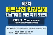 (포탈뉴스통신) 민형배 의원(더불어민주당, 광주 광산을)이 마련한 '제2차 베트남전 인권침해 진실규명을 위한 국회 토론회'가 내일(25일) 오전 9시 30분부터 국회의원회관 제5간담회의실에서 개최된다. 이번 토론회는 베트남전 파병군인 인권침해에 대한 진실규명 문제를 논하는 최초의 공개 토론회이다. 지난 9월 30일 민형배 의원은 '베트남전쟁 시기 대한민국 국군에 의한 민간인 및 파병군인 등에 대한 인권침해 사건 진실규명특별법안'(민형배 의원 등 30명 공동발의, 이하 베트남전 진실규명법)을 발의했다. 이 법안은 한국군에 의한 집단학살 등 인권침해 사건뿐만 아니라 파병군인의 자살·전쟁 후유증 등을 조사 범위에 포함하도록 한다. 법안 발의에 이어 개최되는 이번 토론회에서는 베트남전 파병군인이 겪은 군 내부 폭력·자살·전쟁 후유증 등의 인권침해를 중심으로 논의한다. 양현아 서울대 법학전문대학원 명예교수가 사회를 맡고, 하미학살 피해생존자 응우옌티탄이 영상 발언을 통해 베트남전 진실규명법 제정을 국회와 시민사회에 호소한다. 노용석 교수(국립부경대학교)가 “베트남전 파병과 민주주의, 그리고 파병군인의 인권침해”를