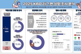 (포탈뉴스통신) KBO는 2025 KBO 리그에 대한 팬 인식과 소비 행태를 분석하기 위해 전문 조사업체인 ㈜글로벌리서치를 통해 온라인 팬 성향 조사를 실시했다. 본 조사는 KBO 리그 생중계 또는 하이라이트를 1회 이상 시청한 만 15세 이상 남녀 4,000명을 대상으로 진행됐다. 조사 결과, 최다 관중 기록을 돌파한 2025년 KBO 리그에 대해 응답자의 73.5%는 KBO 리그가 ‘성장했다’고 인식했으며, 관람 및 시청 빈도가 높은 팬층일수록 이러한 인식이 더욱 뚜렷하게 나타났다. 또한 응답자의 61.4%가 올해 KBO 리그를 직접 관람한 경험이 있다고 답했으며, 내년 KBO 리그를 직접 관람할 의향이 있다고 응답한 비율은 79.9%를 기록했다. 경기 운영 제도에 대해서도 긍정적인 평가가 이어졌다. ABS에 대한 인지도는 94.6%로 가장 높게 나타났다. 또한, 응답자의 81.7%는 피치클락, 체크스윙 비디오판독 등 변경된 제도가 경기 관람에 긍정적인 영향을 미쳤다고 인식했으며, 평균 경기 시간(3시간 2분)에 대해서도 응답자의 69.8%가 ‘적당하다’고 평가해 현 경기 템포와 운영 전반에 대한 수용도가 높은 것으로
