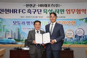 (포탈뉴스통신) 충북 진천군은 군청 소회의실에서 HR레포츠 주식회사(대표 신호룡)와 ‘진천 HR FC 축구단 육성 및 지원을 위한 업무협약’을 체결했다고 24일 밝혔다. 이번 협약은 2026년 대한축구협회 K4 리그 참가를 앞두고, 진천 HR FC의 안정적인 운영 기반을 마련하고, 지역 스포츠 발전을 위한 협력 체계를 구축하기 위해 추진됐다. 협약식에는 송기섭 진천군수와 HR레포츠(주) 신호룡 대표, 김화영 진천군 체육회장, 김중기 진천군 축구협회장 등 관계자들이 참석했다. 협약의 주요 내용은 △축구단 운영과 발전 지원 △유소년 축구 육성과 저변 확대 △지역사회 공헌 활동 △스포츠마케팅을 통한 지역 홍보 강화 등이다. 군은 이번 협약을 통해 지역 스포츠 브랜드 가치 제고, 군민 스포츠 관람 문화 정착, 유소년·생활 체육 연계 강화 등 다양한 효과를 기대하고 있다. 앞으로 군은 행정적·재정적 지원과 경기장 관련 시설 활용 지원 등에 협력하고, HR 레포츠는 선수단 운영, 스포츠마케팅, 유소년 프로그램 운영 등을 총괄하며 지역 축구 문화 확산에 힘쓸 예정이다. 송기섭 군수는