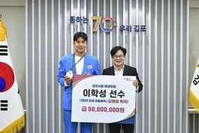 (포탈뉴스통신) 김포시는 17일 김포시청 소통실에서 2025 도쿄 데플림픽 태권도 +80kg급 금메달을 획득한 이학성 선수에게 포상금을 수여하며 그간의 노고를 격려했다. 이날 수여식에는 김병수 김포시장을 비롯해 교육문화국장, 체육과장, 지도자가 참석했으며 이학성 선수에게는 입상 포상금 5,000만원이 수여됐다. 데플림픽은 올림픽과 동등한 위상을 지닌 청각장애인 올림픽으로, 세계 최정상급 선수들만이 출전하는 국제 스포츠 무대다. 이학성 선수는 이번 도쿄 데플림픽 +80kg급에서 금메달을 획득하며, 데플림픽 태권도 종목 역사상 전 세계 최초의 4연패라는 불멸의 기록을 세웠다. 이학성 선수는 2013년 소피아, 2017년 삼순, 2022년 카시아스두술, 2025년 도쿄 데플림픽까지 네 차례 연속 금메달을 석권하며, 12년간 단 한 번도 정상의 자리를 내주지 않은 유일한 선수다. 세대교체와 국제 경쟁이 치열한 가운데서도 이어진 이 성과는, 이학성 선수가 세계 무대에서 독보적인 강자임을 다시 한번 증명했다. 김포시청 태권도팀 소속인 이학성 선수는 2017년 김포시청 입단 이후 대한민국을 대표하는 간판 선수로