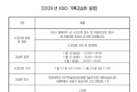 (포탈뉴스통신) 2026년 KBO 기록강습회가 1월 30일(금)부터 2월 1일(일)까지 서울 한양대학교에서 개최된다. 기록강습회는 야구 공식기록법의 보급과 이해를 통한 저변 확대를 목적으로 프로야구 원년인 1982년부터 개최됐다. 강습회에서는 KBO 공식기록원들의 현강감 있는 강의를 바탕으로 프로야구에서 사용되는 공식기록지 작성법, 기록 및 경기 규칙 등이 함께 다루어질 예정이다. 수강 신청자에게는 현장에서 실습용 야구기록지와 기록 가이드북이 교재로 제공된다. 강습회 종료일에는 전체 강습 과정의 이해도를 가늠할 기록지 작성 테스트가 실시되며, 테스트 성적 우수자에게는 수료증이 발급된다. 수강 신청은 1월 21일(수) 오후 1시부터 23일(금) 오후 5시까지 KBO 홈페이지 수강신청 접수 창을 통해 가능하며, 기타 문의사항은 KBO 홈페이지 내 기록위원회 스코어링 필드 1:1 문의하기를 이용하면 된다. [뉴스출처 : KBO]