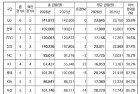 (포탈뉴스통신) 2026 신한 SOL KBO 리그가 오늘(10일) 열린 잠실, 고척, 수원, 대전, 대구 경기에 총 9만 1,459명이 입장하며 100만 관중을 달성했다. 이로써 오늘 경기까지 누적 관중 101만 1,465명을 기록하며 역대 최소 경기인 55경기만에 100만 관중을 달성했다. 종전 기록은 2025시즌에 기록한 60경기다. 오늘 55경기만에 달성함에 따라 종전 기록을 5경기 앞당겼다. 역대 최단 기간 100만 관중 돌파 신기록도 세워졌다. 3월 28일(토) 개막전을 시작으로 14일만에 100만 관중 돌파에 성공해 종전 최단 기록이었던 지난 시즌의 16일을 이틀 앞당겼다. 프로야구 최초로 1,200만 관중 돌파(최종 1,231만 2,519명)에 성공한 지난 시즌보다 빠른 추세로 관중을 불러모으는 중이다. 개막전부터 10만 5,878명이 입장해 4년 연속 개막전 전 구장 매진으로 시작한 이번 시즌은 지난해 동일 경기 수 대비(55경기 기준) 누적 관중이 4% 증가했다. 평균관중도 지난해 1만 7,876명에서 1만 8,390명으로 늘어 마찬가지로 2.89%의 증가 폭을 기록했다. 구단별로는