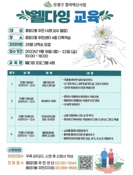 (포탈뉴스) 은평구 응암2동은 주민자치회 주관으로 오는 10월 6일부터 ‘웰다잉 교육’ 프로그램을 주민센터 다목적실에서 실시할 예정이라고 밝혔다.