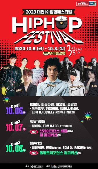 노기수 대전시 문화관광국장은 “젊은 에너지가 넘치는 도시를 만들기 위해 올해 새롭게 선보이는 K-힙합페스티벌에 시민 여러분의 많은 관심과 참여를 부탁드린다”라면서 “이번 행사는 힙합문화 선도도시로서의 입지를 구축하고 원도심 경제도 살리는 일석이조의 효과가 있을 것으로 기대한다”고 말했다.