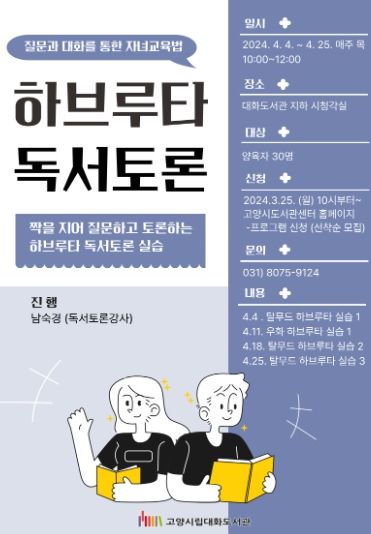 (포탈뉴스) 고양특례시 대화도서관은 오는 4월 4일 오전 10시부터 시청각실에서 부모교육 특강 '하브루타 독서토론'을 운영한다고 밝혔다.