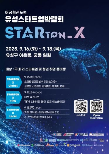 (포탈뉴스통신) 대전 유성구는 오는 9월 16일부터 18일까지 어궁동(어은동·궁동) 일원에서 창업·투자·취업이 어우러진 ‘유성스타트업박람회 STARTON X’를 개최한다.