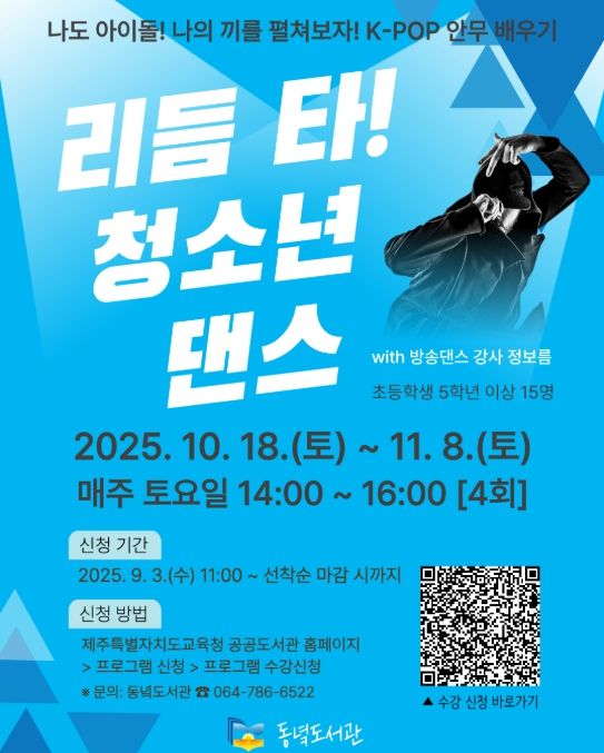 (포탈뉴스통신) 제주도교육청 동녘도서관은 10월 18일부터 오는 11월 8일까지 청소년의 문화·예술 감수성을 키우고 건강한 신체 활동 기회를 제공하기 위해 ‘2025년 리듬 타! 청소년 댄스’를 운영한다