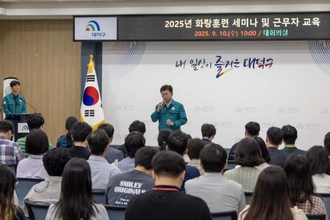 (포탈뉴스통신) 대전 대덕구는 10일 구청 대회의실에서 직원 100여 명이 참석한 가운데 ‘2025년 화랑훈련 대비 세미나 및 근무자 교육’을 실시했다고 밝혔다.