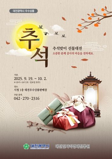 (포탈뉴스통신) 대전시는 민족 최대의 명절 추석을 앞두고 지역 우수 상품을 널리 알리고 지역경제 활성화에 기여하기 위해 9월 19일부터 10월 2일까지(주말 제외) 10일간 시청 1층 대전우수상품판매장(TJ마트)에서 ‘추석맞이 선물대전’을 연다.