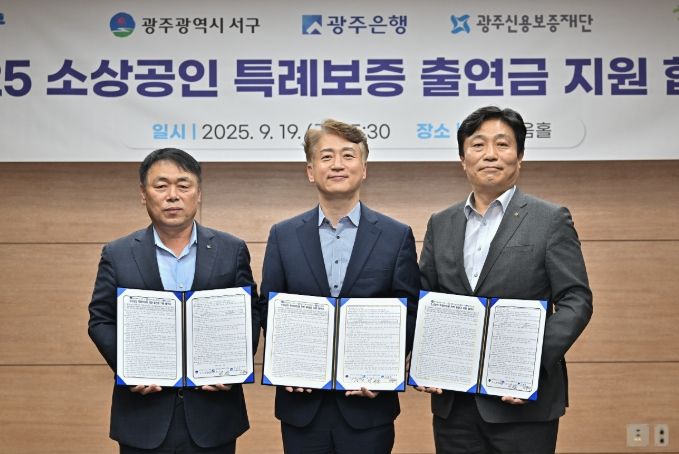 (포탈뉴스통신) 광주은행은 19일, 광주광역시 서구청에서 김이강 광주광역시 서구청장과 이상채 광주은행 부행장, 염규송 광주신용보증재단 이사장 등이 참석한 가운데, 광주광역시 서구 및 광주신용보증재단과 ‘서구 소상공인 특례보증 업무협약’을 체결했다고 밝혔다.