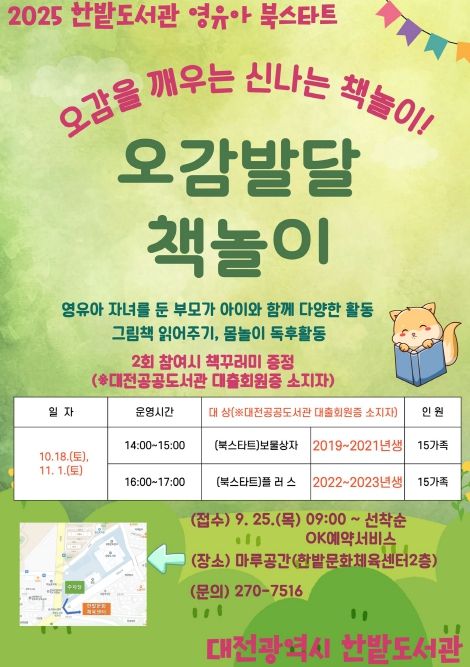 (포탈뉴스통신) 대전 한밭도서관은 상반기에 이어 하반기에도 영유아 독서문화 프로그램 ‘북스타트’를 운영한다고 24일 밝혔다. 대상은 지역 내 3세부터 7세 아동이다.