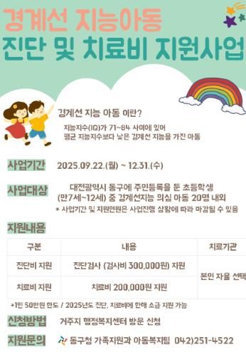 지원 대상은 동구에 주소를 둔 초등학생(만 7~12세) 중 경계선지능 의심 아동 20명 내외이며, 사업 기간은 2025년 12월 31일까지다.