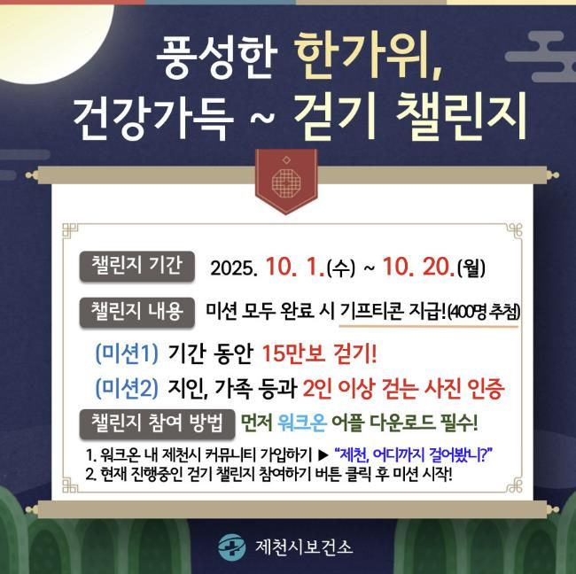 (포탈뉴스통신) 제천시보건소는 추석 연휴를 맞아 시민의 걷기 실천을 돕기 위해 ‘풍성한 한가위, 건강가득 걷기 챌린지’를 운영한다.