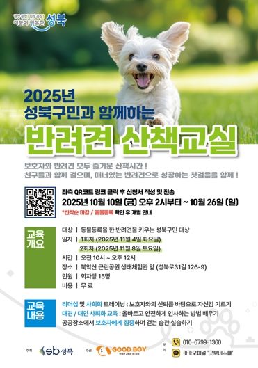 (포탈뉴스통신) 서울시 성북구가 11월 4일과 8일 전문가와 함께하는 체험형 반려견 산책교육을 실시한다. 이번 교육은 성북구민과 반려견이 함께 참여해 산책 습관과 사회화 훈련을 배우는 프로그램이다.