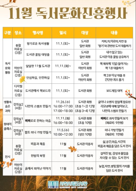 (포탈뉴스통신) 사천시는 사천시립도서관에서 11월 한 달 동안 책과 함께 여유로운 시간을 보내며 감성을 채울 수 있는 다양한 독서문화행사와 체험 프로그램을 운영한다고 17일 밝혔다.