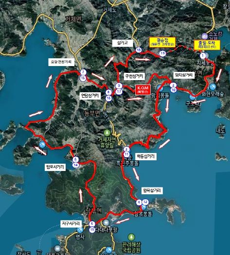 거제 대회 구간은 일운면 지세포유람선 주차장을 출발하여 망치삼거리, 학동삼거리, 함목삼거리, 저구사거리, 탑포사거리, 오망천삼거리, 연담삼거리, 구천삼거리, 삼거교, 망치고개를 2회 순회하고 지세포유람선 주차장으로 돌아오는 코스로, 총 104.3km에 달한다.