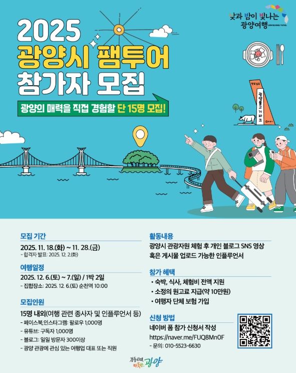 (포탈뉴스통신) 광양시가 낮과 밤이 빛나는 광양의 매력적인 관광자원을 직접 체험하고, 감각적인 콘텐츠로 널리 홍보할 영향력 있는 ‘2025 G-관광 팸투어’ 참가자를 모집한다.