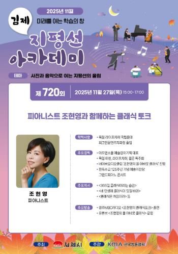 (포탈뉴스통신) 다양한 분야의 명사를 초청해 시민의 문화적 소양의 높이고 삶의 품격을 더하는 교양 강좌인 김제지평선아카데미가 오는 27일 제720회 강좌에 조현영 아트앤소울 예술강의기획 대표를 초청해 “피아니스트 조현영과 함께하는 클래식 토크”라는 주제로 강연을 진행한다.