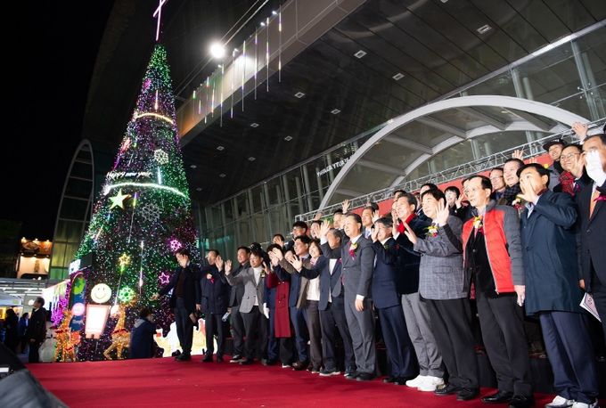 행사는 식전공연을 시작으로 성탄축하예배, 축사, 불우이웃돕기 물품전달식, 트리 점등 순으로 진행됐다. 점등과 함께 겨울 하늘을 밝힌 트리의 빛은 내년 1월 말까지 시민들에게 희망과 온기를 전할 예정이다.