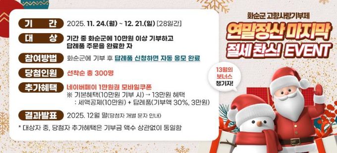 (포탈뉴스통신) 화순군은 연말을 맞아 고향사랑기부제 ‘연말정산 마지막 절세 찬스!’ 이벤트를 오는 11월 24일부터 12월 21일까지(28일간) 진행한다고 밝혔다.