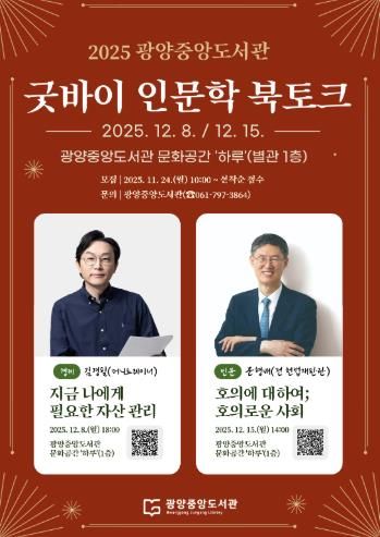 (포탈뉴스통신) 광양중앙도서관은 연말을 맞아 시민들의 자기성찰과 삶의 재정비를 돕기 위한 '굿바이 인문학 북토크'를 운영한다고 밝혔다.