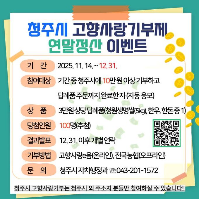 시 관계자는 “연말정산 시즌을 맞아 청주시에 마음을 보내주신 기부자 분들께 감사한 마음을 전하기 위해 이벤트를 마련했다”며 “청주시민과 기부자 모두가 만족하는 청주시 고향사랑기부제가 될 수 있도록 적극 노력하겠다”고 밝혔다.