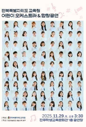 (포탈뉴스통신) 전북특별자치도교육청은 오는 29일 전주학생교육문화회관 1층 공연장에서 ‘2025 전북특별자치도교육청 어린이 오케스트라 & 합창공연’을 개최한다.