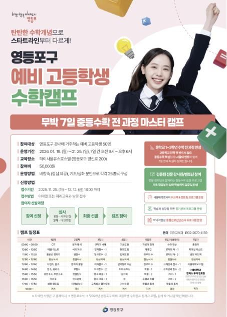 (포탈뉴스통신) 영등포구가 고등학교 진학을 앞둔 관내 중학생을 대상으로 ‘예비 고등학생 수학캠프’를 운영하고, 12월 12일까지 참가자 50명을 모집한다고 밝혔다.