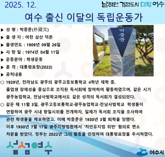 (포탈뉴스통신) 여수시는 2025년 12월의 독립운동가로 전라남도 여천 삼산 덕촌 출신의 ‘박종문(朴鍾文)’ 선생을 선정했다.