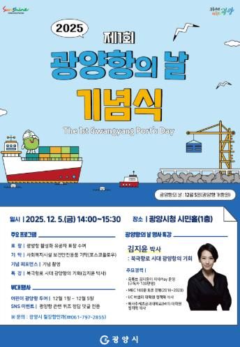 (포탈뉴스통신) 광양시는 오는 12월 5일 오후 2시 시청 시민홀에서 ‘제1회 광양항의 날’ 기념식을 열고 명사 특강을 진행한다고 밝혔다.