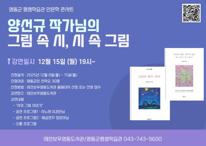 (포탈뉴스통신) 충북 영동군은 지역 출신 작가의 시와 그림을 통해 군민들에게 회복과 위로의 메시지를 전하고, 독서 문화 확산을 위한 인문학 북콘서트를 개최한다.
