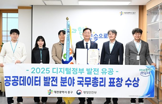 (포탈뉴스통신) 대전 중구는‘2025 디지털정부 발전 유공 정부포상’공공데이터 발전 부문에서 전국 기초자치단체 중 유일하게 국무총리 기관 표창을 수상했다고 4일 밝혔다.