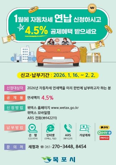 (포탈뉴스통신) 목포시는 1년치 자동차세를 1월에 미리 납부하면 세액 공제 혜택을 받을 수 있는 ‘자동차세 연납제도’를 한 달간 운영한다고 밝혔다.