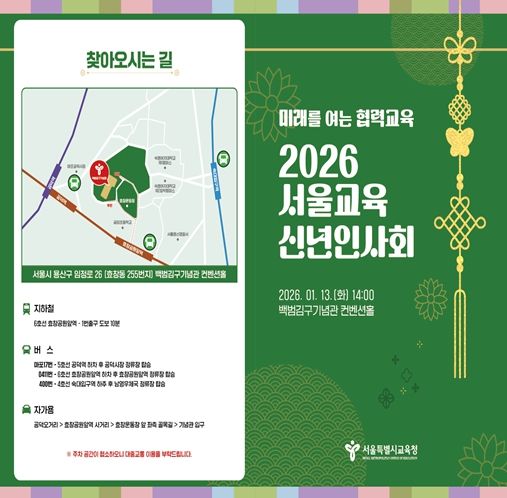 (포탈뉴스통신) 서울특별시교육청은 오는 1월 13일에 용산구 백범김구기념관 컨벤션홀에서 ‘2026년 서울교육 신년인사회’를 개최한다.