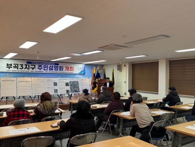 (포탈뉴스통신) 김천시는 2026년 지적재조사사업 실시계획에 따른 사업지구 지정을 위하여 1월 13일 평화동 보훈회관에서 부곡3지구 토지소유자 및 이해관계인 등을 대상으로 주민설명회를 개최했다.