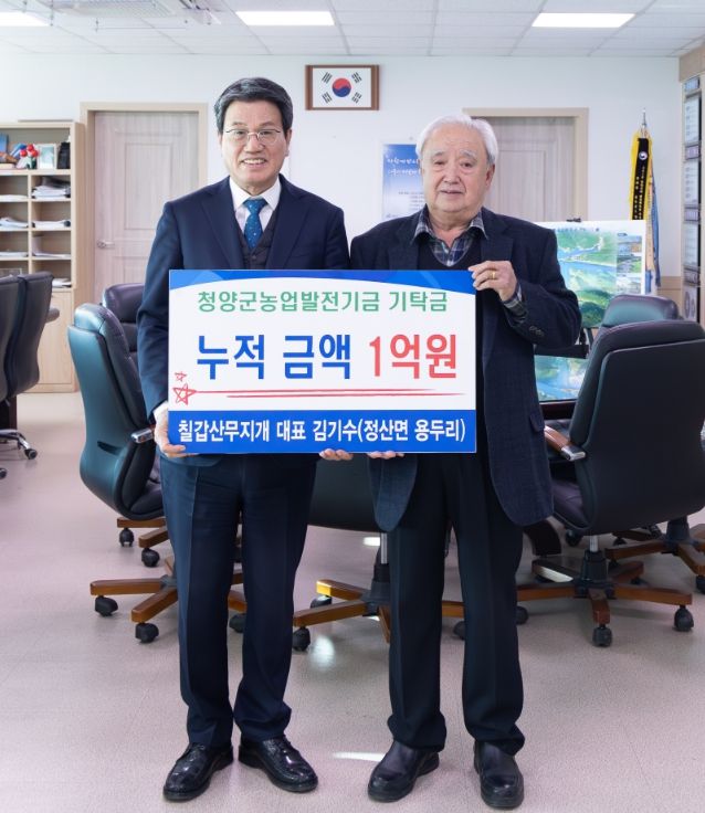 (포탈뉴스통신) 청양군은 정산면 용두리 소재 ‘칠갑산무지개’의 김기수 대표가 군청을 방문해 농업발전기금 1,000만 원을 기탁하면서 올해로 마침내 누적 기탁금 1억 원을 달성했다고 밝혔다.