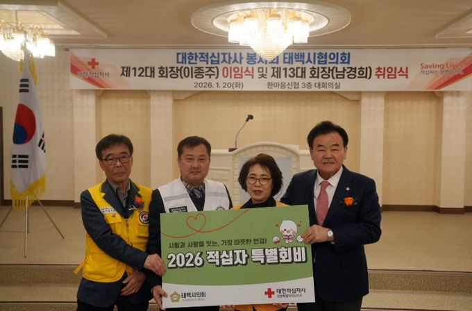 (포탈뉴스통신) 태백시의회는 지난 20일 대한적십자봉사회 태백시협의회장 이·취임식에 참석하여 적십자 특별회비 200만 원을 기탁했습니다.