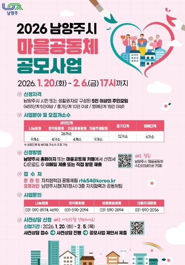 (포탈뉴스통신) 남양주시는 1월 20일부터 2월 6일까지 ‘2026년 마을공동체 공모사업’참여 공동체를 공개 모집한다.