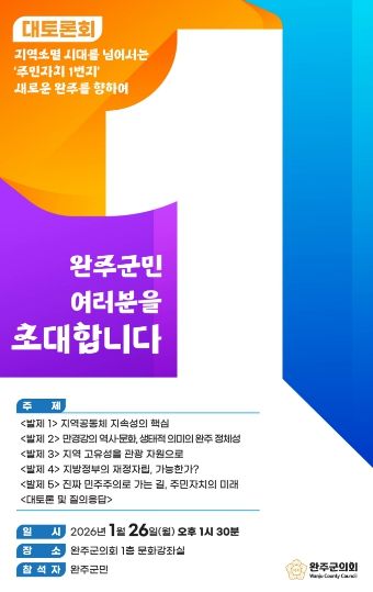 토론회에는 완주군의회 의원을 비롯해 완주군민, 완주군 공무원 등 70여 명이 참석할 예정이며, 주제 발표와 토론, 질의응답이 결합된 참여형 토론 방식으로 진행된다.