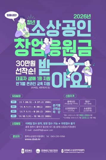 (포탈뉴스통신) 충북도와 (재)충청북도기업진흥원(소상공인지원센터)이 ‘2026년 청년 소상공인 창업응원금 지원사업’의 1분기 참여자 250명을 1월 26일부터 오는 3월 27일까지 선착순으로 모집한다.