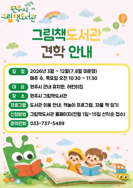 (포탈뉴스통신) 원주시 그림책도서관은 오는 3월부터 12월까지 관내 유치원과 어린이집을 대상으로 어린이 견학 프로그램을 운영한다.